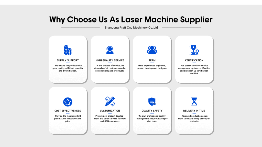 Shandong Pratt CNC Machinery Co., Ltd. is committed to a pro-duct management philosophy centered around “quality, effici-ency, inno-vation, and service.” Our goal is to become a leading domestic supp-lier of laser equipment. Currently, our main products include laser mar-king machines, handheld laser welding machines, laser cleaning machines, automatic platform welding machines, highp-ower laser welding machines, portable laser welding machines, air-cooled integrated welders, pulse cleaning machines, laser pipe cu-tting machines, and laser cutting machines, forming a comprehen-sive range of laser welding solutions. We recognize that oppor-tunities and challenges coexist, prompting us to explore and inno-vate. In the future, we aim to achieve development through inno-vation, improve customer experiences with high-quality products and services, and create value for our customers, partners, and so-ciety through an honest and efficient business model.